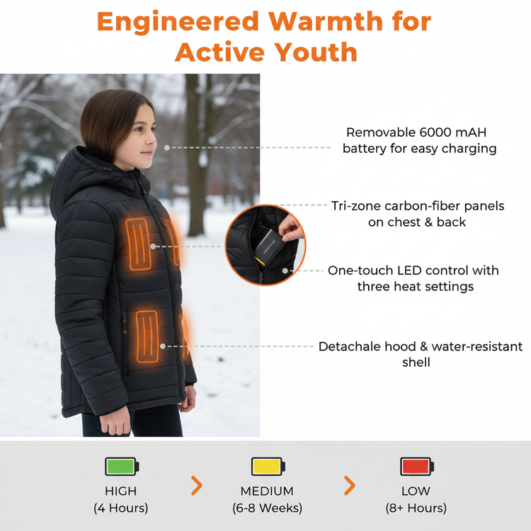 Our puffer jacket’s tri-zone heating panels deliver consistent warmth to chest and back, so kids can focus on fun. The lightweight, water-resistant shell keeps moisture out. Detachable hood adds extra protection on chilly days.